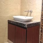 Kitchen set & Minibar terintegrasi dengan bahan material ACP (Aluminium Composite PAnel) dengan warna dominan abu-abu dan cream.